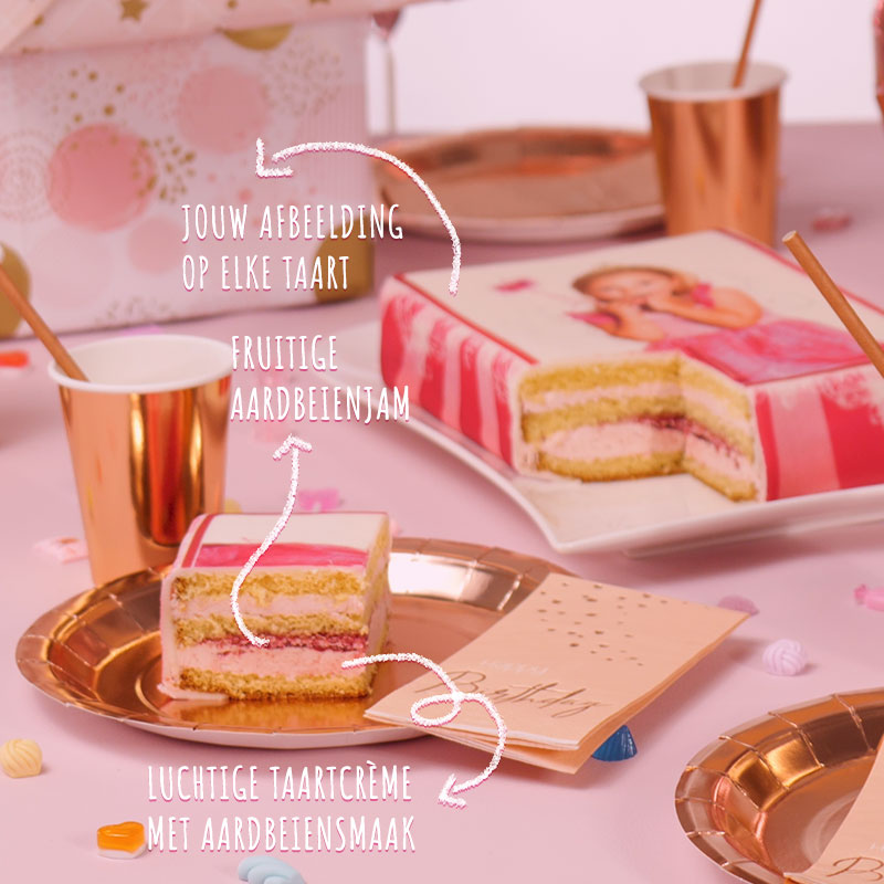 Ben je op zoek naar een volledig persoonlijke, creatieve taart? En wil je de jarige echt eens een origineel geschenk geven? Of je hebt zelf nog een mooie taart nodig voor op je eigen verjaardagsfeest? Onze fototaart Medium, de echte klassieker onder de fototaarten, is de perfecte taart voor elke gelegenheid, of het nu gaat om een verjaardagsfeest, een familiefeest of gewoon als iets lekkers voor tijdens de koffiepauze. Door je eigen foto, een mooie kader errond en eventueel een persoonlijke boodschap, wordt deze taart ongetwijfeld het hoogtepunt van je feest of een zeer leuke verrassing! De fototaart Medium heeft een grootte van 25 op 17 centimeter en je haalt er ongeveer 12 porties uit, perfect geschikt voor verjaardagsfeesten of familiebijeenkomsten! Zijn 12 porties echter te weinig of juist iets te veel? Onze Fototaarten vind je ook in maat L (voor zo’n 30 personen) of in maat S (voor ongeveer 6 personen). Als je een taart wil bestellen voor meer dan 30 personen, bijvoorbeeld met je bedrijfslogo voor op bedrijfsfeesten of beurzen, contacteer je best even onze Klantenservice. Op onze website kan je via de photo editor, die zeer eenvoudig te gebruiken is, je fototaart helemaal zelf creëren. Upload en bewerk je foto, kies je favoriet uit onze verschillende fotokaders, en schrijf er eventueel nog een persoonlijke tekst bij die je erop wil laten drukken. Laat je creativiteit dus gerust de vrije loop! Wij drukken dan je foto, kader en tekst op onze heerlijke eetbare prints, die bestaan uit het beste marsepein van het merk Odense. Zo krijg je een heel unieke en creatieve taart! Ben je van plan om zelf de taart te bakken en zoek je nog een taartbekleding om je taart mee te versieren? Bij de Eetbare prints kan je zelf je eetbare print uit marsepein ontwerpen en door ons laten produceren! Daar kan je ook kleinere eetbare prints uit fondant voor bijvoorbeeld cupcakes bestellen. Wil je je taart graag nog meer versieren met mooie taartdecoratie? Bij de categorie Decoratie vind je een ruim aanbod aan taartdecoratie, zoals marsepeinen figuren en kaarsen, om jouw fototaart helemaal af te maken! Tover je fototaart om tot een echt kunstwerk met deze taartdecoratie en eetbare prints! Bovendien kan je voor je taart ook een van onze verschillende smaakcombinaties kiezen en de fototaart dus aanpassen naar wat je zelf lekker vindt. Ben je op zoek naar andere fototaarten? Neem dan een kijkje op onze fototaarten pagina. Hier vind je allerlei heerlijke fototaarten, zoals de face cake in maat M en de luxe cijfertaart met foto, om jouw feestje helemaal perfect te maken! Waar wacht je dus nog op? Bestel nu eenvoudig online je volledig gepersonaliseerde fototaart voor jouw verjaardag of als uniek en persoonlijk geschenk voor je geliefde, vrienden of familie! Wij bedrukken je taart met je foto, pakken ze veilig in en laten ze met DHL of UPS bij jouw thuis of een ander adres bezorgen op je gewenste leverdatum!