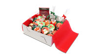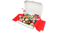 Jij kiest waar je kerst geschenkdoos bezorgd moet worden en hebt de mogelijkheid om een persoonlijke kaart toe te voegen. Onder "extra opties" bij onze kerst geschenkdoos kun je je persoonlijke boodschap voor de ontvanger schrijven. De kerst geschenkdoos met heerlijke kerstlekkernijen is ook een smakelijke verrassing voor de volgende advent of als een klein tussendoortje voor winterse magische momenten. De heerlijke kersttaarten aan het stokje zijn bereid in de kerstsmaken chocoladetaart met marsepein en vanille-taart met speculaas. Daarna worden de zoete kerstballetjes in betoverende glazuren van suiker en chocolade gedoopt. Tot slot worden de afgewerkte kersttaarten aan het stokje versierd met prachtige kerstdecoraties van suiker en zorgvuldig verpakt. Naast de kerst-Cake-Pops zitten er ook schattige kerstkoekjes met kerstmotieven bij, die per twee kerstkoekjes worden verpakt. Het kerstmotief wordt met eetbare kleurstof op fondant gedrukt, zodat de kleine kerstcadeautjes goed zichtbaar zijn.