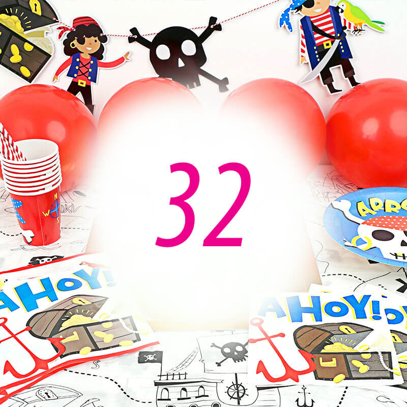 Is deze partyset te groot voor jouw piratenfeest? De piraten partyset is ook verkrijgbaar met taart en ook voor 8 en 16 personen: